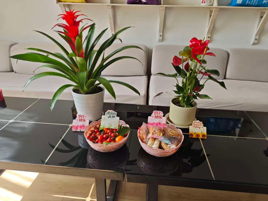 本次布置以“温馨实用”为原则,工作人员提前筹备,在各休息室摆放鸿运当头、红掌等绿植花卉,为休憩空间增添节日氛围;同时设置“暖心补给点”,搭配鲜果摆盘与零食礼包,为教学科研一线的老师们提供便利补给。休息区专属祝福角摆放的定制贺卡,更传递着后勤服务团队的诚挚敬意。